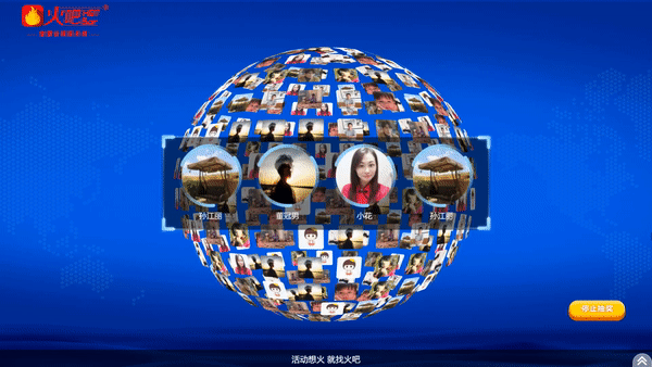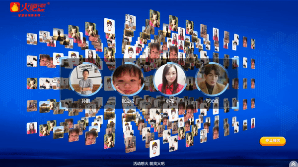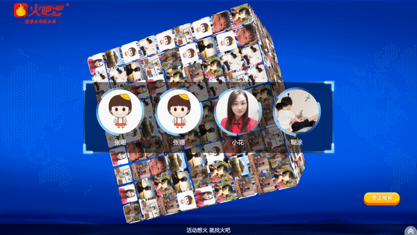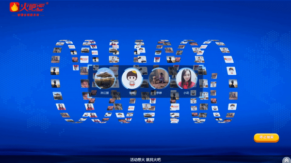 好在火吧及時(shí)上新啦 年會(huì)現(xiàn)場(chǎng)怎么鬧 往下看了都知道 基于3D簽到的基礎(chǔ)上實(shí)現(xiàn)的立體抽獎(jiǎng)動(dòng)畫(huà)效果,僅需會(huì)前微信掃碼錄入基本信息,告別冗余沉悶的紙質(zhì)盲盒抽獎(jiǎng)流程,讓現(xiàn)場(chǎng)氛圍更加熱烈。 ▲立方體旋轉(zhuǎn)效果 ▲地球儀旋轉(zhuǎn)效果 ▲百葉窗旋轉(zhuǎn)效果 ▲卷軸旋轉(zhuǎn)效果 【溫馨提示】 1.工作人員可后臺(tái)限定參與人員表,以防非嘉賓人員參與。 2.花式動(dòng)畫(huà)效果任意選擇,還可根據(jù)會(huì)議主題自定義。 新型暖場(chǎng)互動(dòng),嘉賓掃碼參與游戲后,可以選擇想要參與的戰(zhàn)隊(duì),待游戲開(kāi)始后,兩隊(duì)的“大力士”們通過(guò)搖手機(jī)競(jìng)速,結(jié)束后根據(jù)比分總和一較高下。 ▲比賽進(jìn)行時(shí)的游戲界面